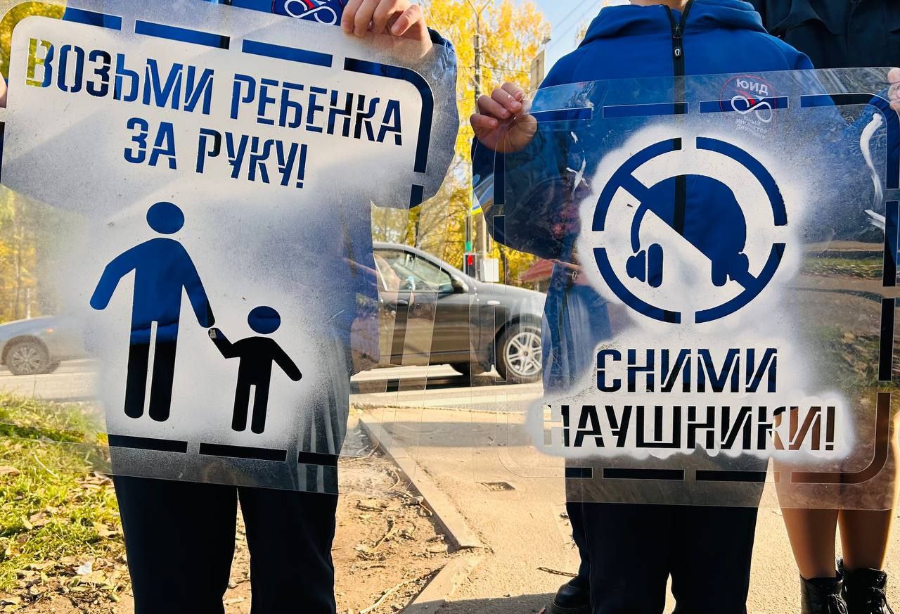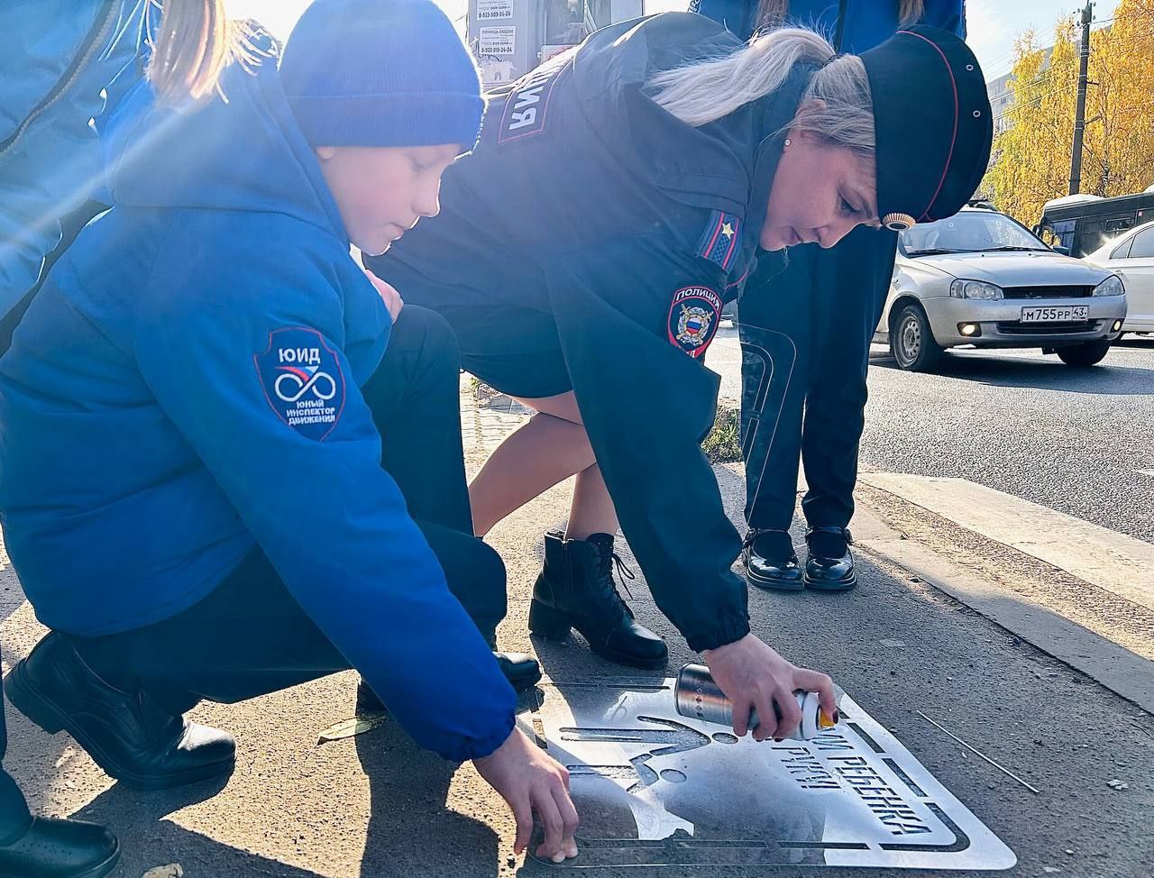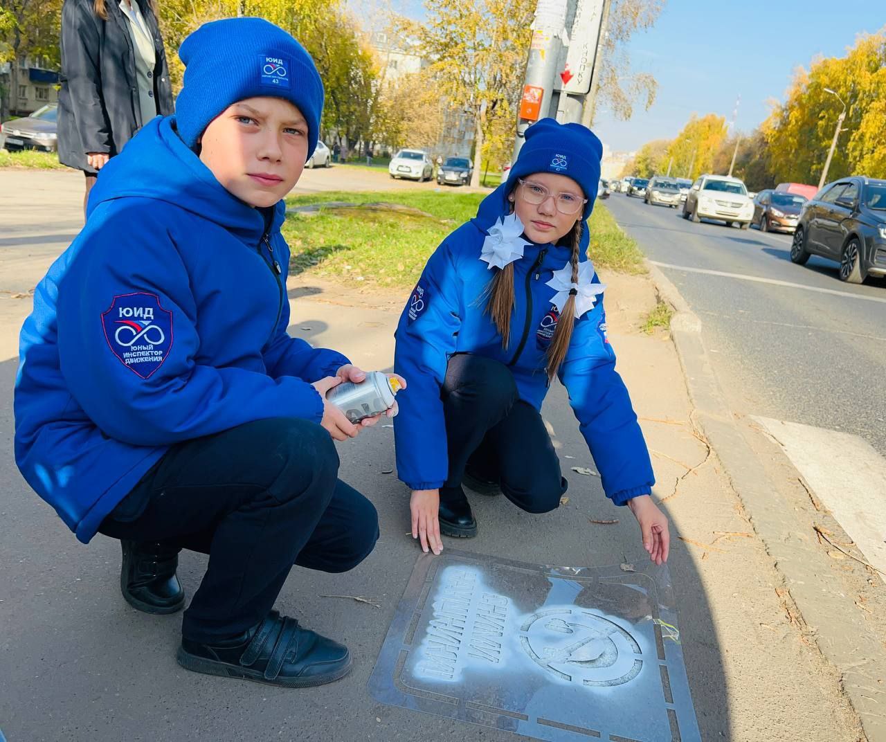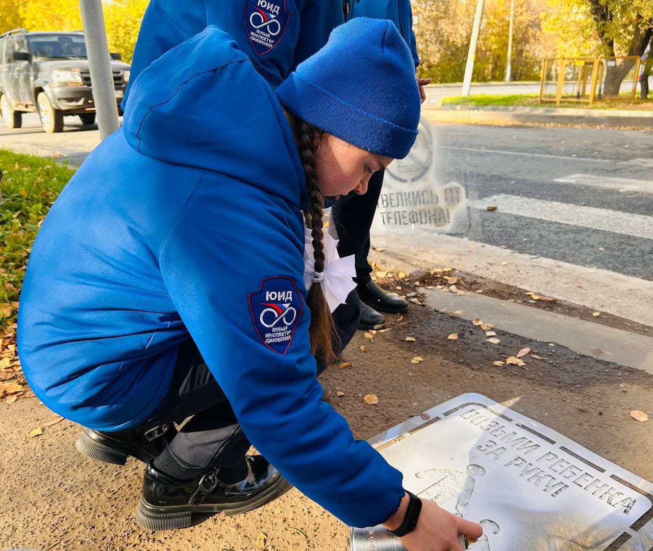 На тротуарах вблизи пешеходных переходов у своей школы юные инспекторы движения с помощью трафаретов «Возьми ребёнка за руку», «Убедись в безопасности», «Сними наушники» нанесли на асфальт надписи с призывами к участникам дорожного движения о неукоснительном соблюдении правил дорожной безопасности.