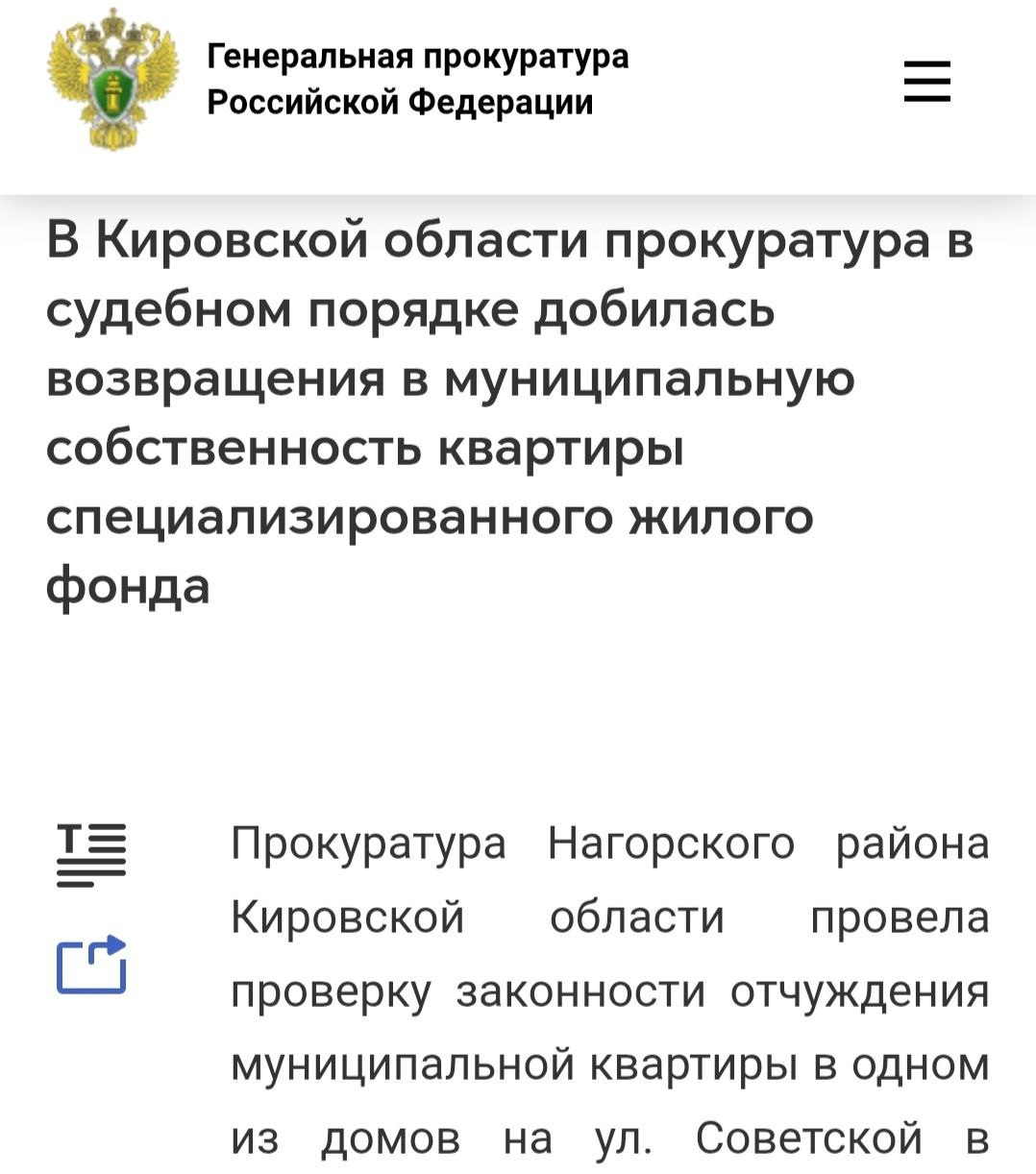 Прокуратура Нагорского района провела проверку законности отчуждения муниципальной квартиры в доме по ул. Советской в г.Нагорск площадью 68,6 квадратных метра, ранее находившейся на учете в специализированном фонде. Жилье данной категории по закону предоставляется в качестве служебного врачам и педагогам.