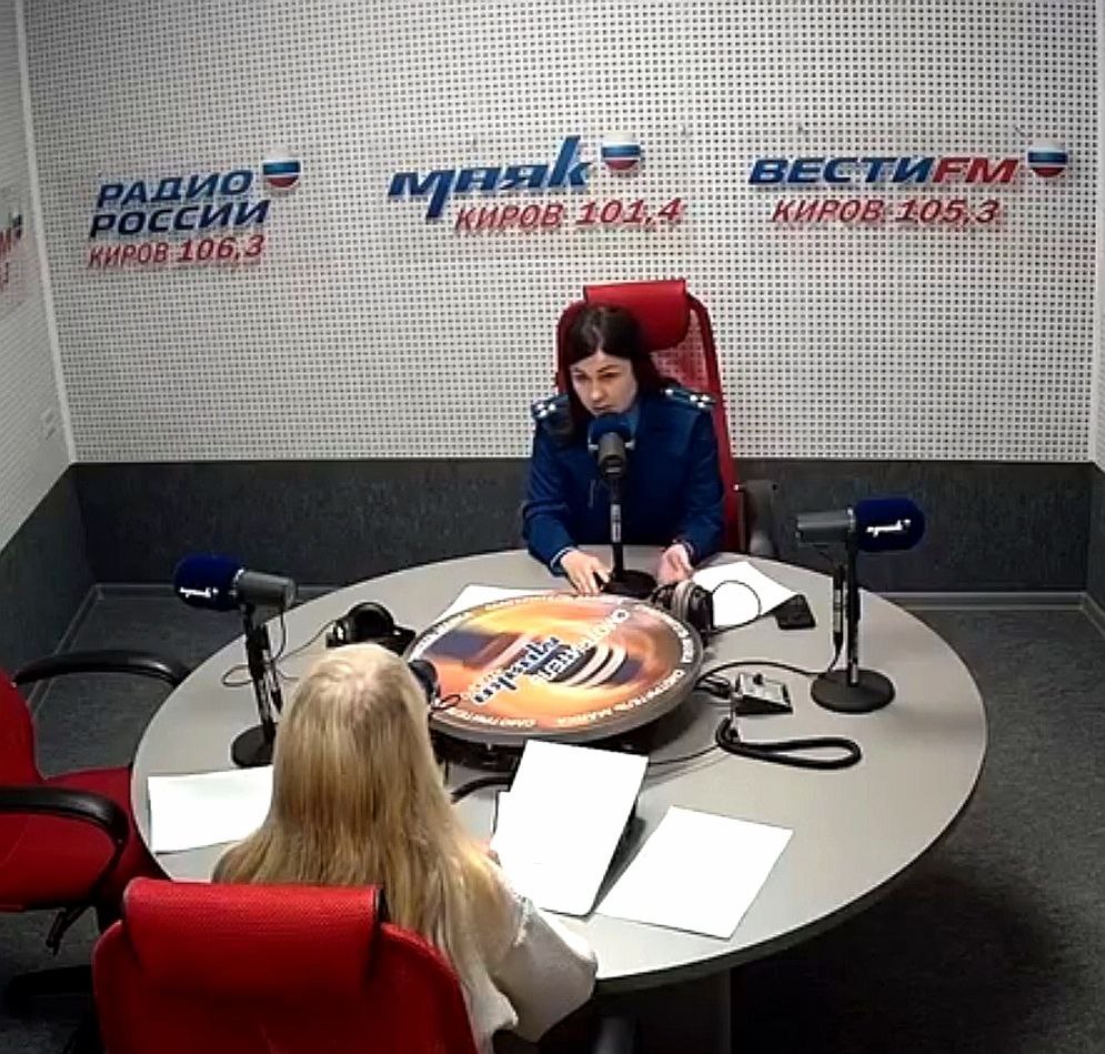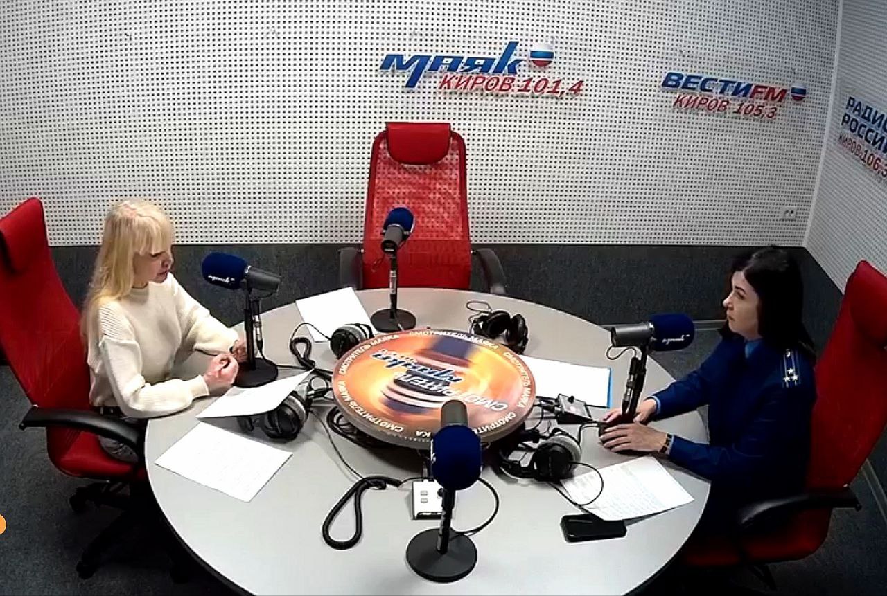 На днях состоялся прямой эфир передачи «В полуденный час» радиостанции «Радио России в Кирове» (106,3 FM) ГТРК «Вятка» с участием заместителя начальника отдела по надзору за исполнением законов о несовершеннолетних прокуратуры Кировской области Елены Сырчиной.