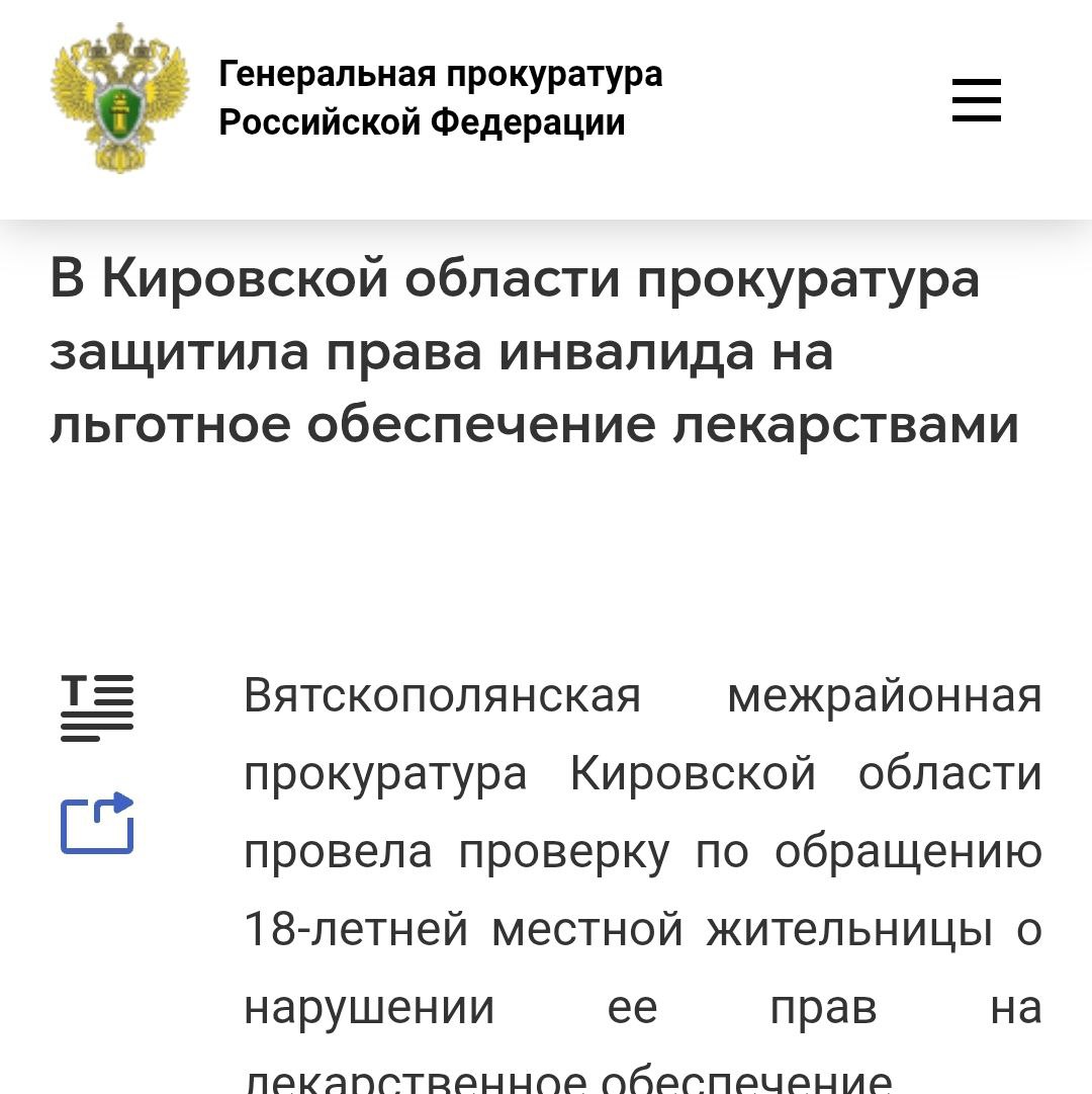 Вятскополянская межрайонная прокуратура установила, что 18-летняя заявительница является инвалидом, страдает прогрессирующим заболеванием, нуждается в применении лекарства, которое рекомендовано ей специалистами после обследования в Российском национальном исследовательском медицинском университете им. Н.И. Пирогова.