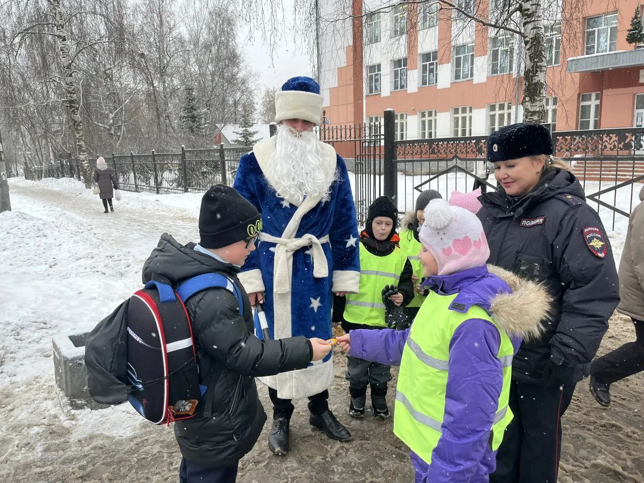 Полицейский Дед Мороз и ЮИД напомнили детям правила поведения на дороге перед новогодними каникулами