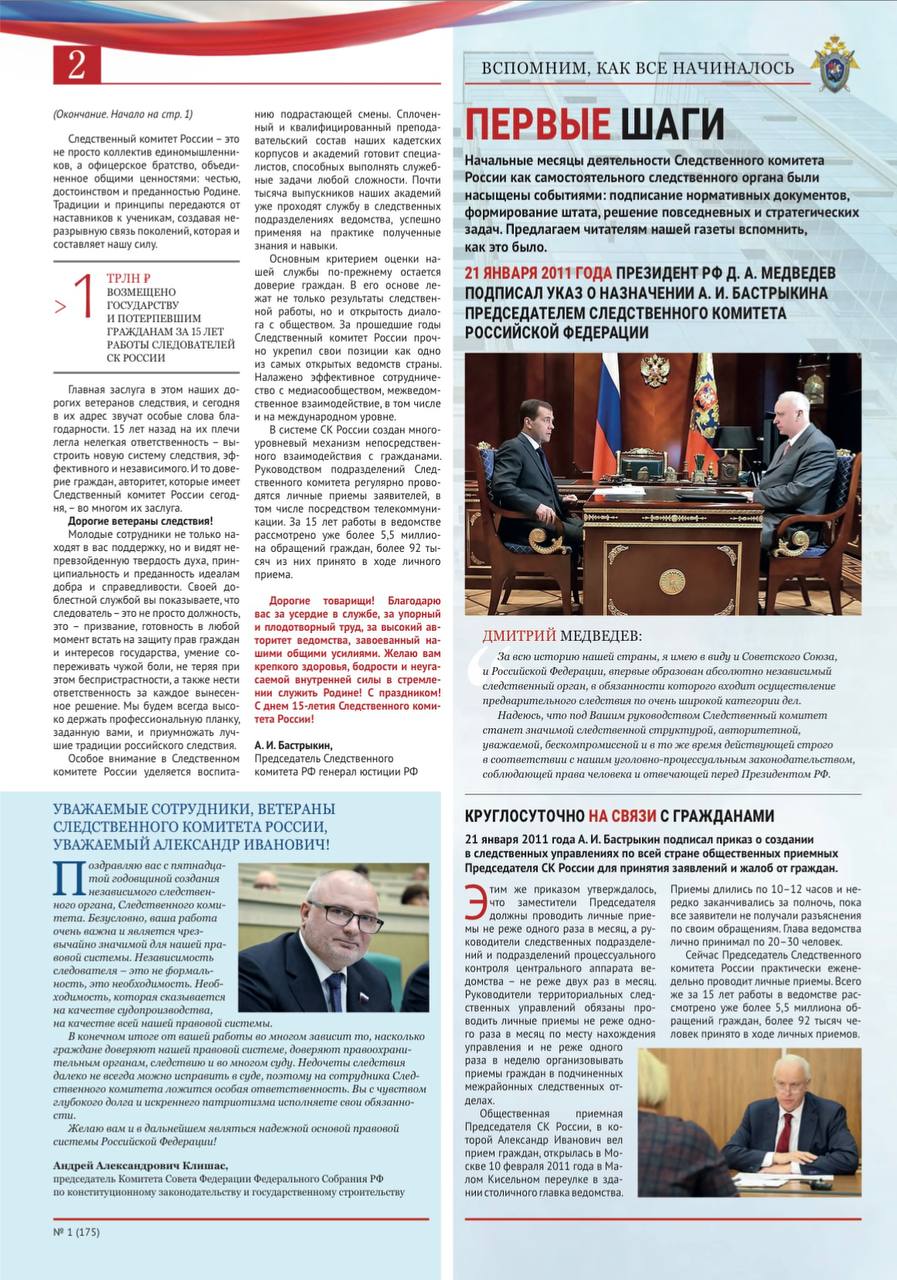 На официальном сайте СК России размещен очередной выпуск газеты «Следственный комитет России» № 1 (175) от 15 января 2026 года
