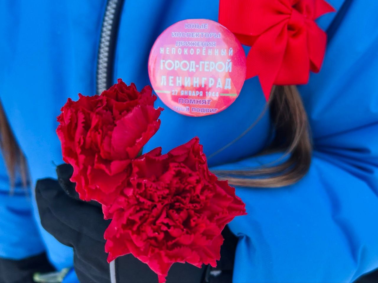 Юные инспекторы движения в честь Дня полного освобождения Ленинграда от фашистской блокады расположили на спинах курток символичную фразу «900 дней и ночей», приковывая внимание прохожих.