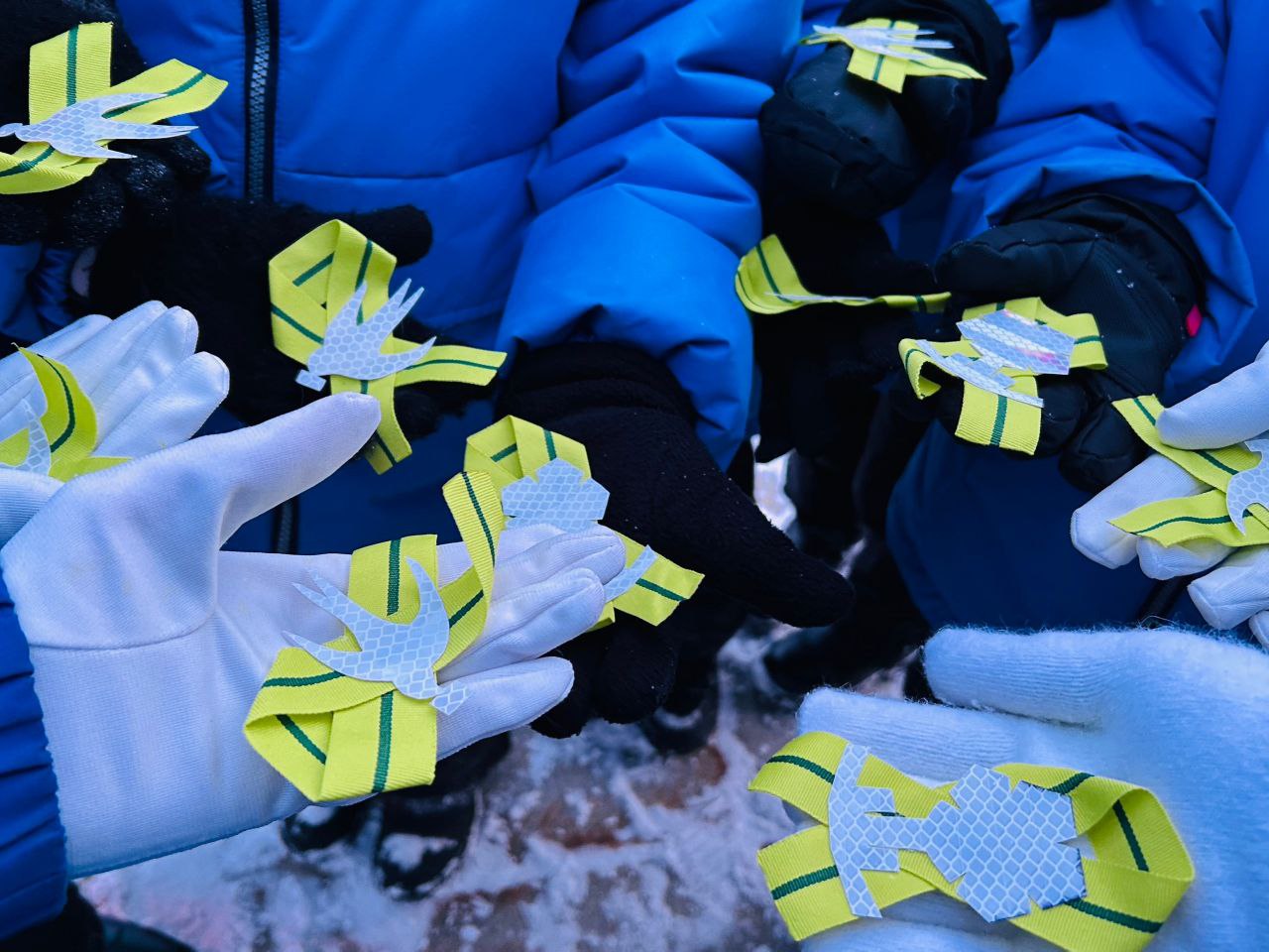 Надпись, выполненная из световозвращающей ленты, напомнила всем и о том, что наличие её в темное время суток на одежде, дает возможность пешеходам быть заметными на дорогах.