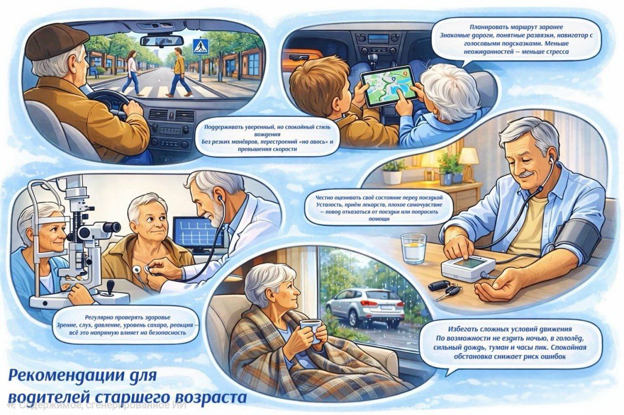Водителям и пешеходам старшего возраста важно учитывать возрастные изменения, которые могут влиять на скорость реакции, внимание и общее самочувствие. Соблюдение простых правил помогает снизить риск дорожно-транспортных происшествий и сохранить здоровье.