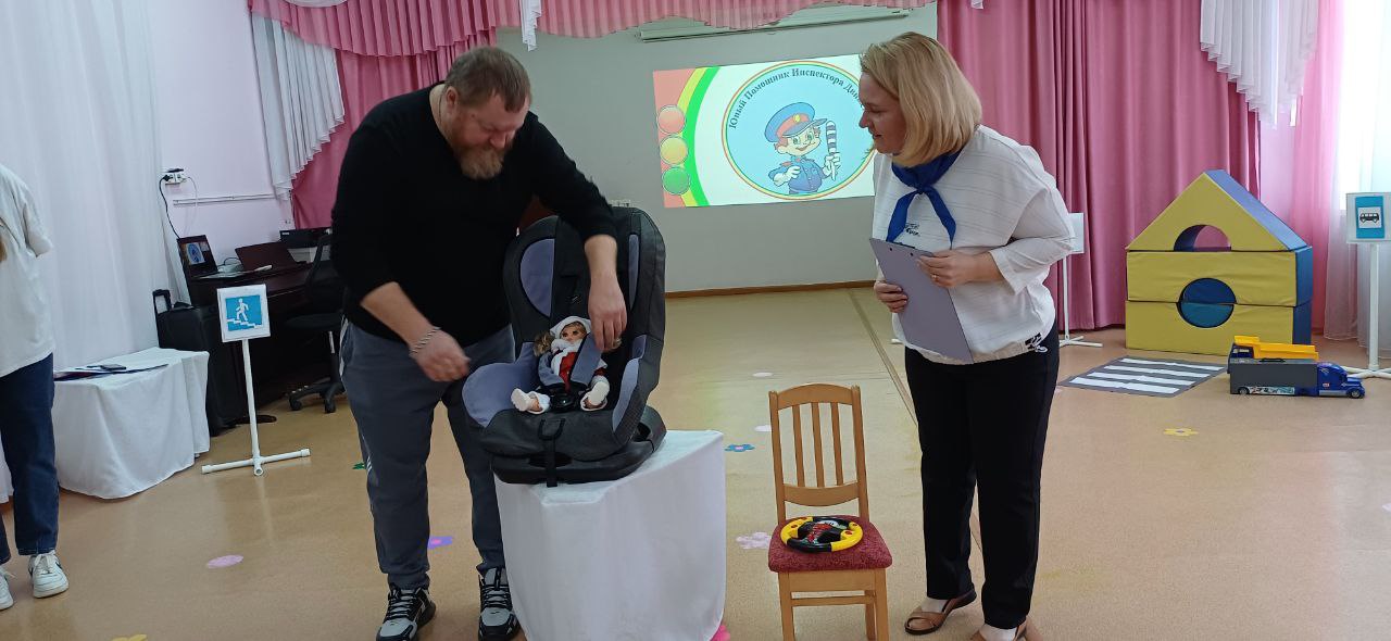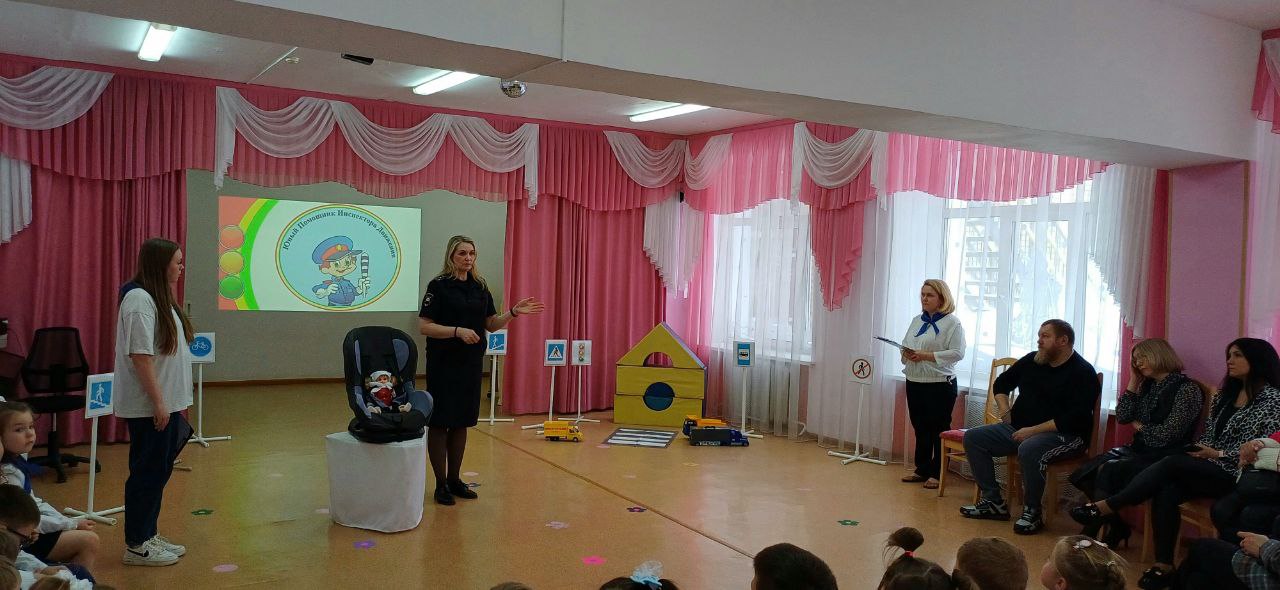 Во время встречи сотрудник Госавтоинспекции рассказала детям и родителям о том, почему важно правильно пристегиваться ремнями безопасности и использовать автокресла при поездках в автомобиле