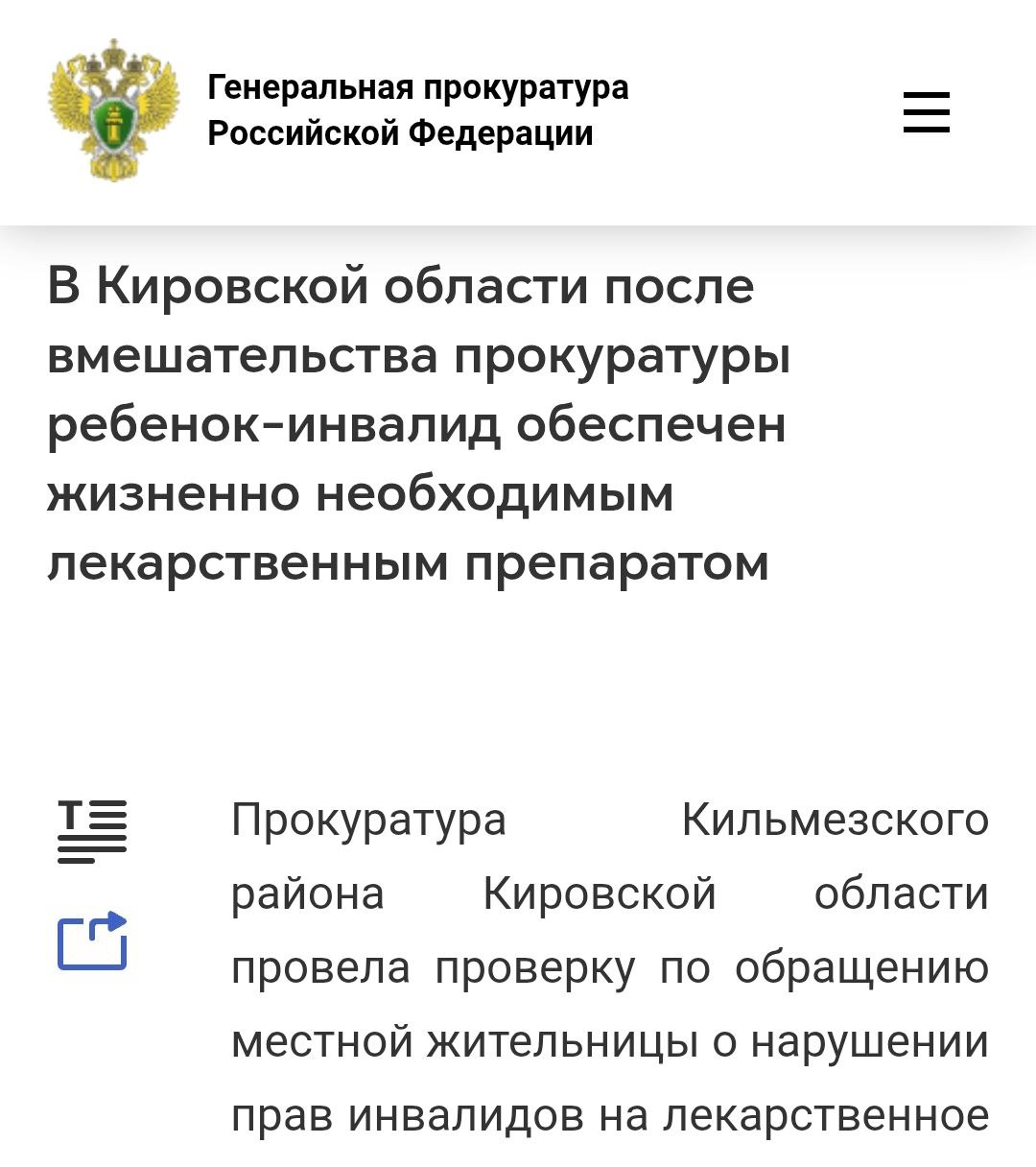 Решение суда и требования надзорного ведомства исполнены, #ребенок-#инвалид обеспечен лекарством и проходит необходимую терапию.
