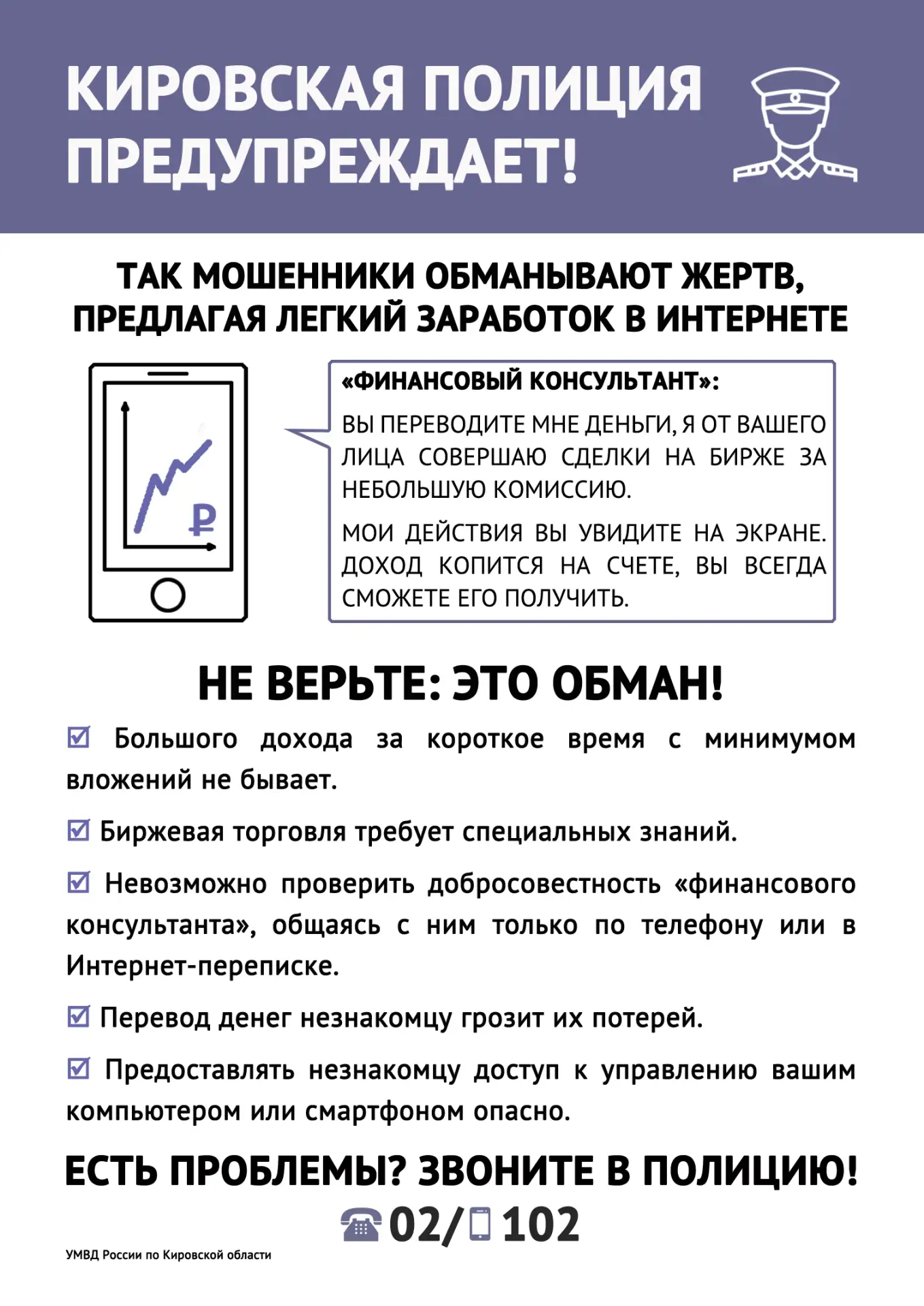 Сотрудники полиции Кировской области напоминают жителям региона, что не следует верить незнакомцам, обещающим свою помощь в получении крупного дохода от инвестиций, торговли акциями и криптовалютой. Такие предложения – уловки злоумышленников, которые пользуются желанием потенциальных жертв разбогатеть быстро и без усилий.