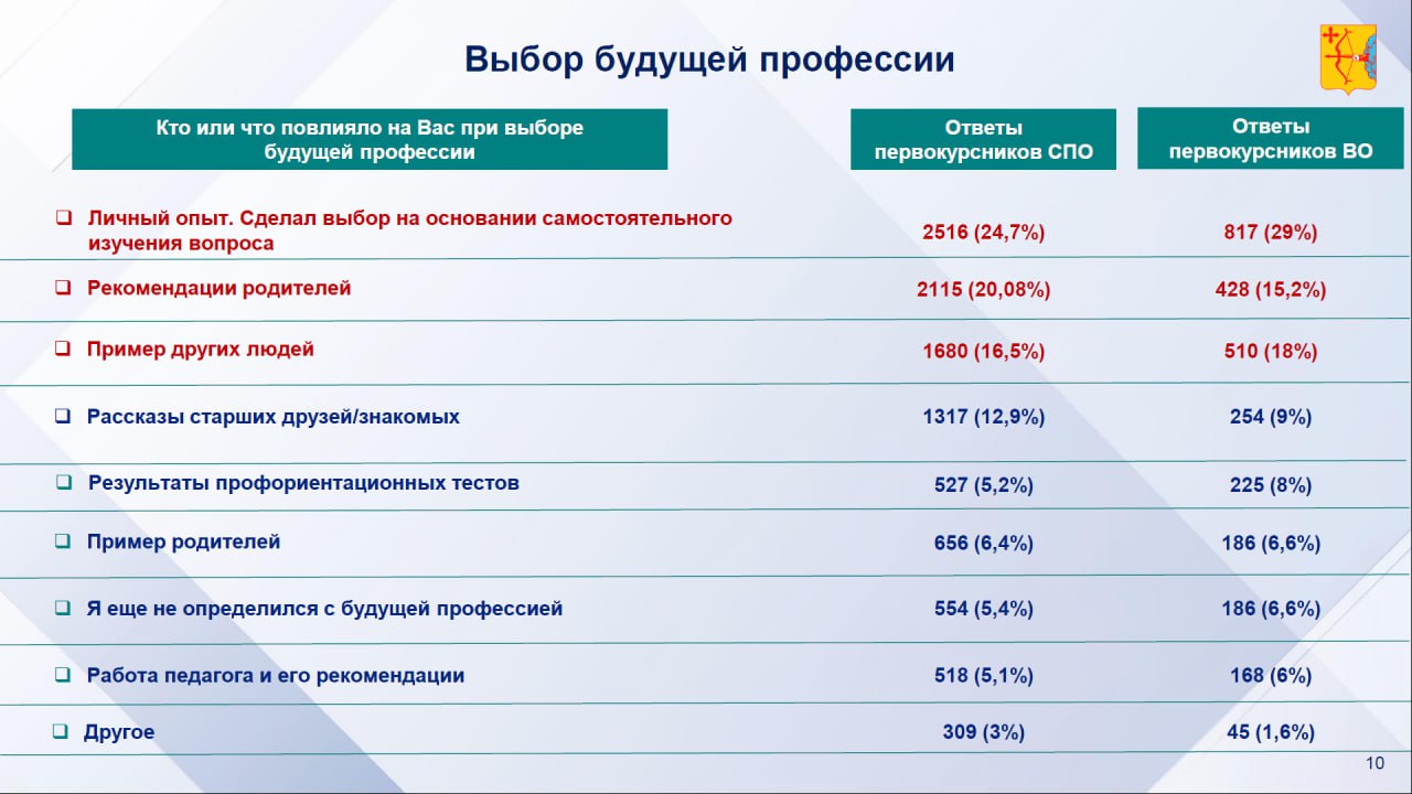 — При выборе профессии каждый четвертый опрошенный отметил, что сделал выбор на основе самостоятельного изучения этого вопроса, руководствовался именно своим мнением. В то же время важными факторами являются рекомендации родителей и примеры других людей.