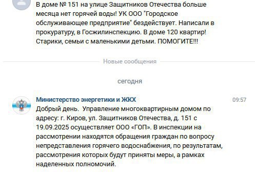 Жильцы позвонили в УК. Но сюрприз. Оказалось, что та обанкротилась. Тогда жители стали обращаться в Госжилинспекцию, администрацию Кирова, министерство ЖКХ. Прошло уже больше месяца - везде идут одни отписки.