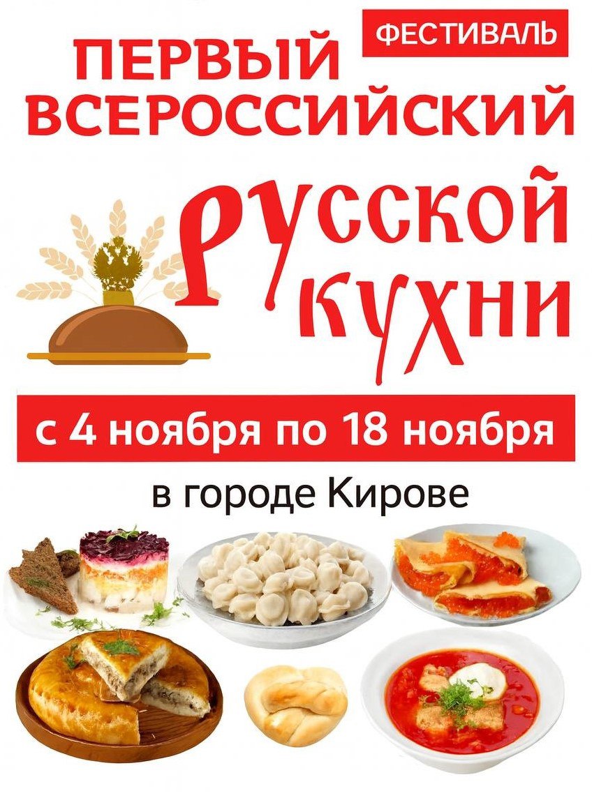 До 18 ноября кировчане могут попробовать такие блюда как уха, рассольник, ушное, скоблянка, жаркое. Помимо супов и горячего, посетителям предложат разнообразную выпечку: курник, кулебяки, рыбники, шаньги, ватрушки и калитки, оладьи и блинчики.