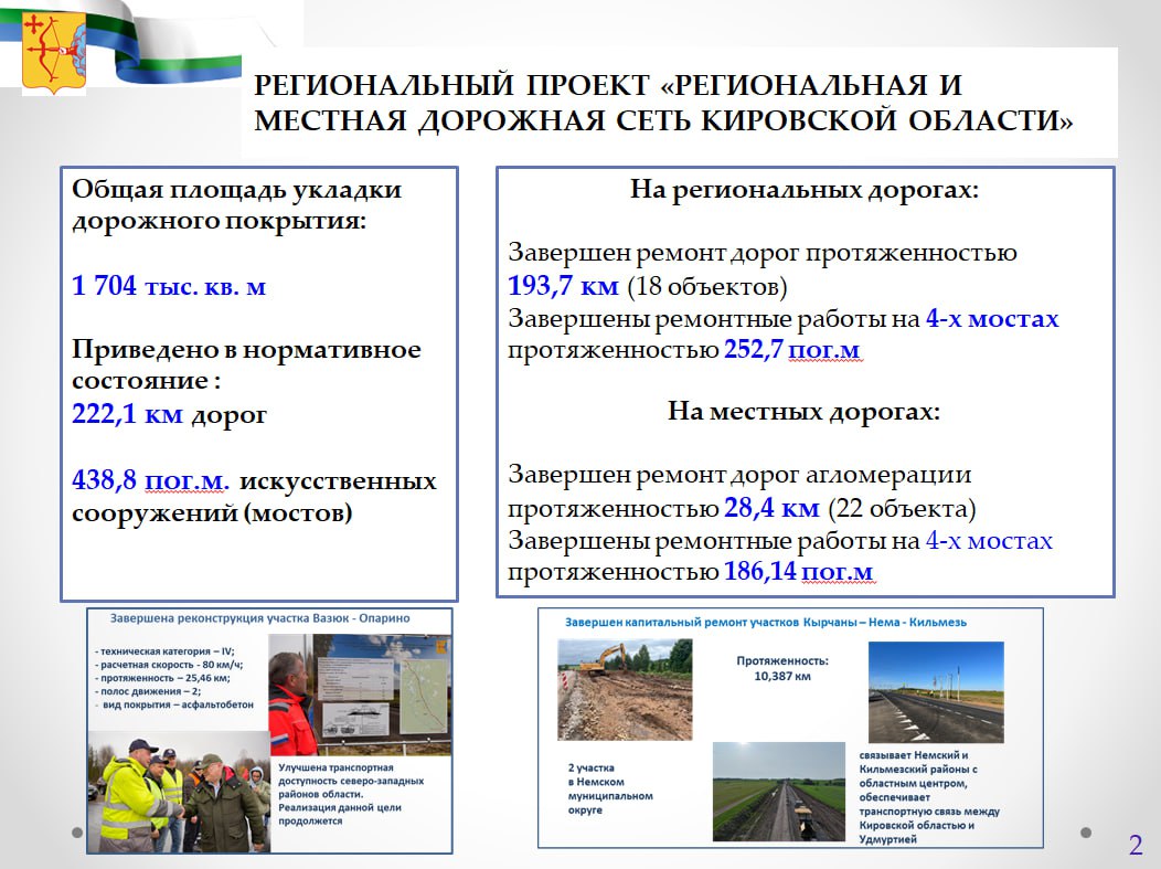В рамках нацпроекта «Инфраструктура для жизни» приведено в нормативное состояние 222,1 км автомобильных дорог. Завершен ремонт дорог общей протяженностью 193,7 км (18 объектов). Завершена реконструкция с устройством асфальтобетонного покрытия участка Вазюк — Опарино автомобильной дороги Киров — Котлас — Архангельск протяженностью 25,5 километра и капитальный ремонт двух участков автомобильной дороги Кырчаны — Нема — Кильмезь в Немском муниципальном округе протяженностью 10,387 км.