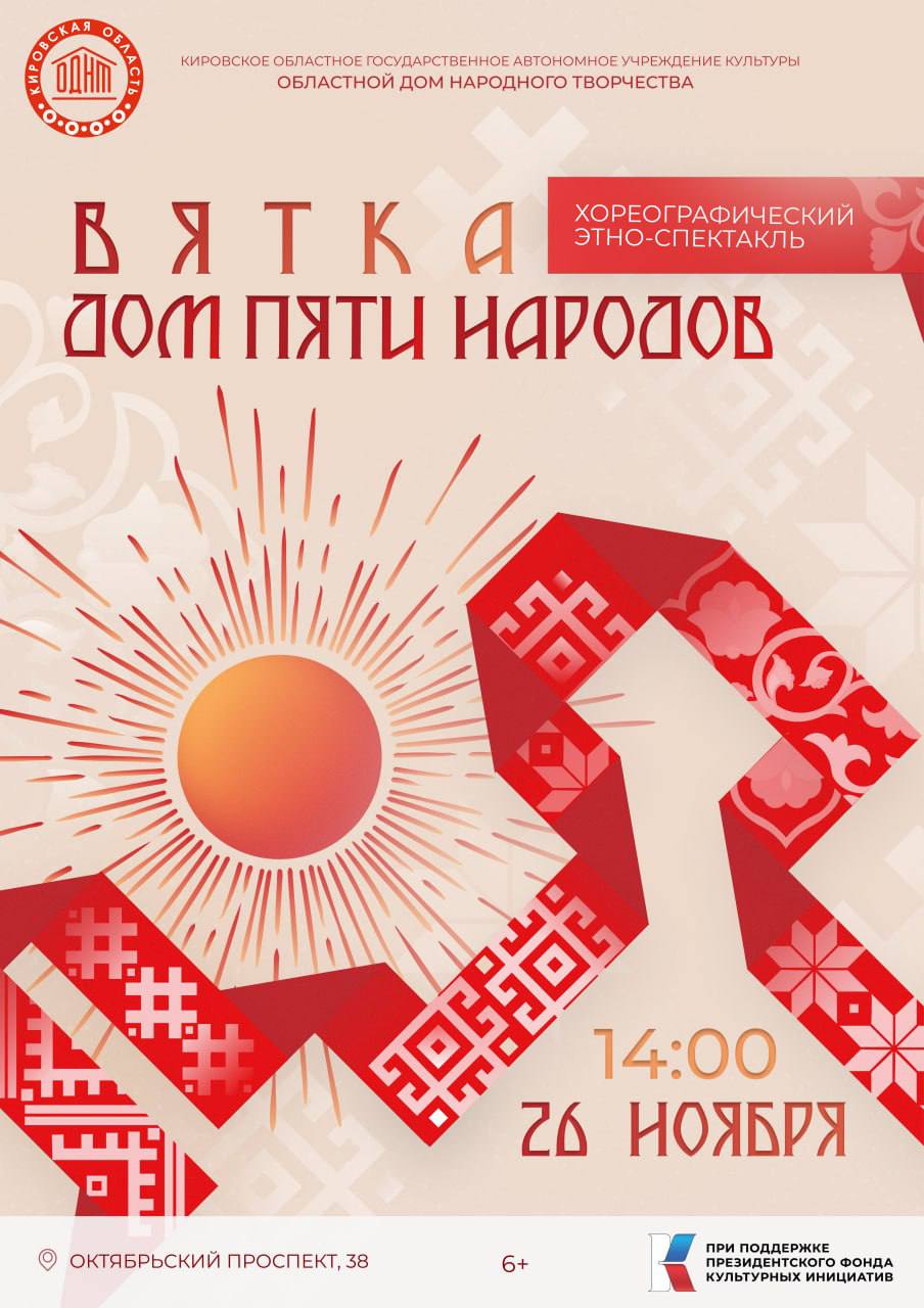 26 ноября в 14:00 в большом зале областного Дома народного творчества состоится премьера хореографического этно-спектакля «Вятка – Дом пяти народов». Проект реализуется при грантовой поддержке Президентского фонда культурных инициатив.