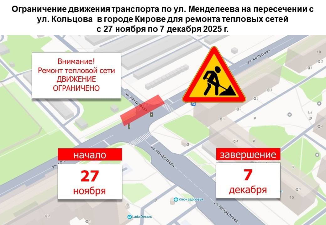 С 27 ноября по 7 декабря в Кирове на пересечении улиц Менделеева и Кольцова запланированы работы по ремонту тепловых сетей, специалисты проведут замену участка изношенных трубопроводов. В связи с этим по улице Менделеева в направлении улицы Луганской будет временно ограничено движение транспорта, сообщили в Кировском филиале «Т Плюс».