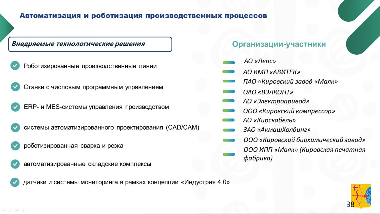 Указанные мною технологии активно внедряются лидерами промышленности Кировской области АО «Лепсе», АО КМП «АВИТЕК», ОАО «ВЭЛКОНТ», АО «Электропривод», ПАО «Кировский завод «Маяк».