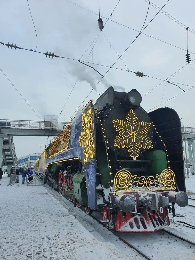 Новогодний транспорт главного волшебника страны – целая праздничная резиденция на колёсах: в составе есть паровоз, салон для приёмов, игровая зона, кукольный театр, сцена, сувенирная лавка и даже ресторан.