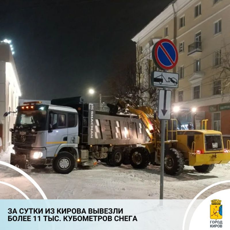 Как сообщили в АО «Гордормостстрой», за сутки из Кирова силами подрядных организаций были вывезены более 11 тыс. кубометров снега. В организации напомнили автовладельцам о необходимости не оставлять транспорт в зоне проведения работ, так как это мешает движению спецтехники и качественной уборке улиц.