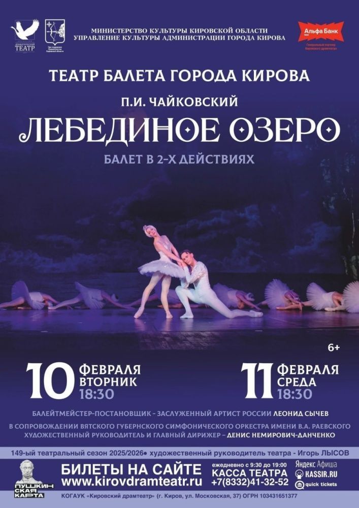 10 и 11 февраля в 18.30 на сцене Кировского драмтеатра состоится показ балета «Лебединое озеро». Это полномасштабный спектакль на музыку П. И. Чайковского в исполнении Театра балета города Кирова в сопровождении Вятского губернского симфонического оркестра имени В. А. Раевского.