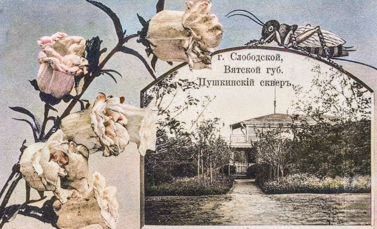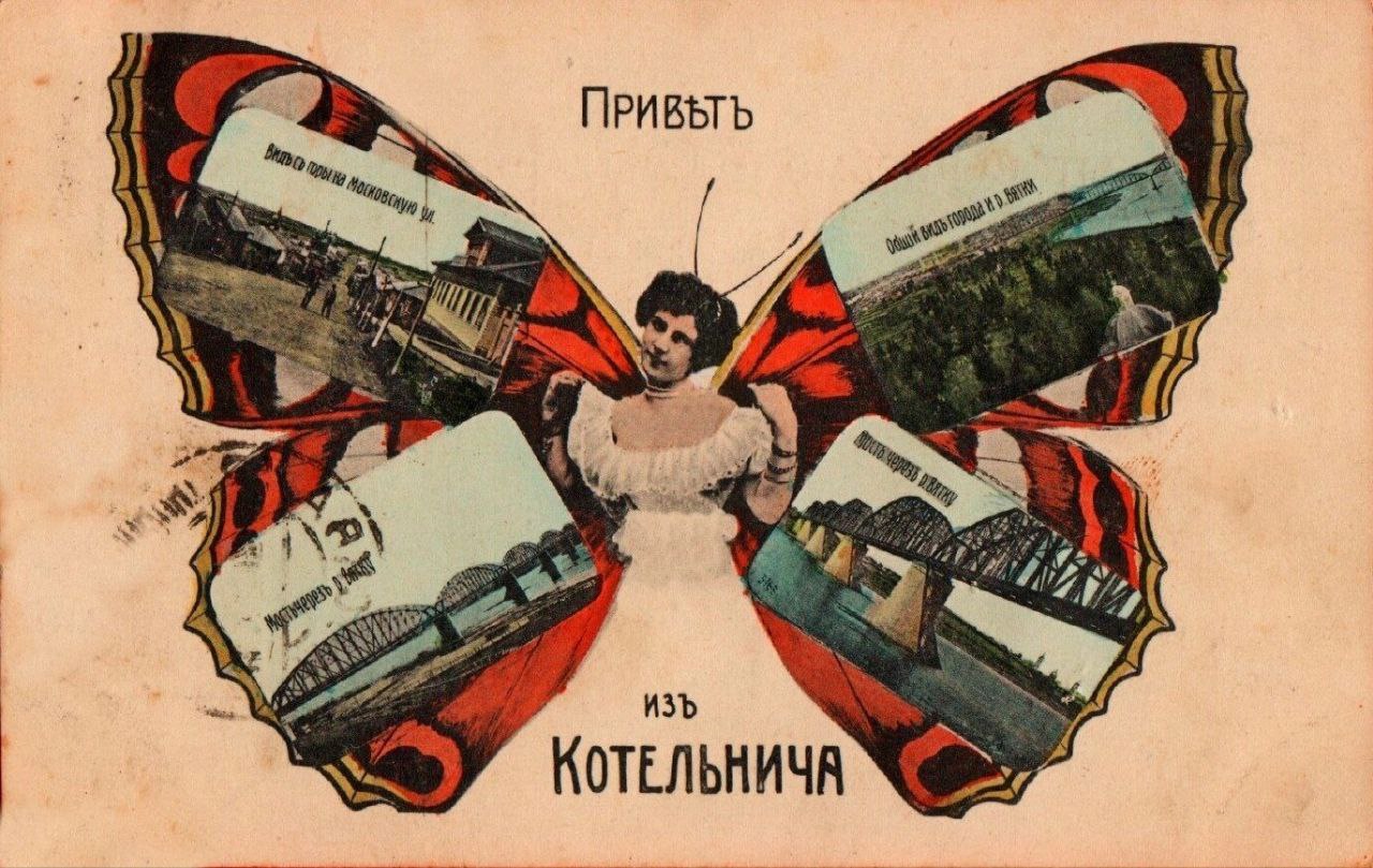 Креатив начала XX в. Открытки с видами уездных городов Вятской губернии. Их отправляли путешественники по Транссибу с дороги своим родным, как весточка, где они побывали. Такие открытки обнаруживают далеко от Вятки, в Санкт-Петербурге, Москве, Рязани. Главное адрес отправки это один из вятских вокзалов. На первой открытке Пушкинский сквер в г.Слободском (кто то знает где он находился?). На второй открытке в цвете знаменитый мост через Вятку в Котельниче. Общий вид города и улица Московская. Эпоха креатив без ИИ и нейросетей!
