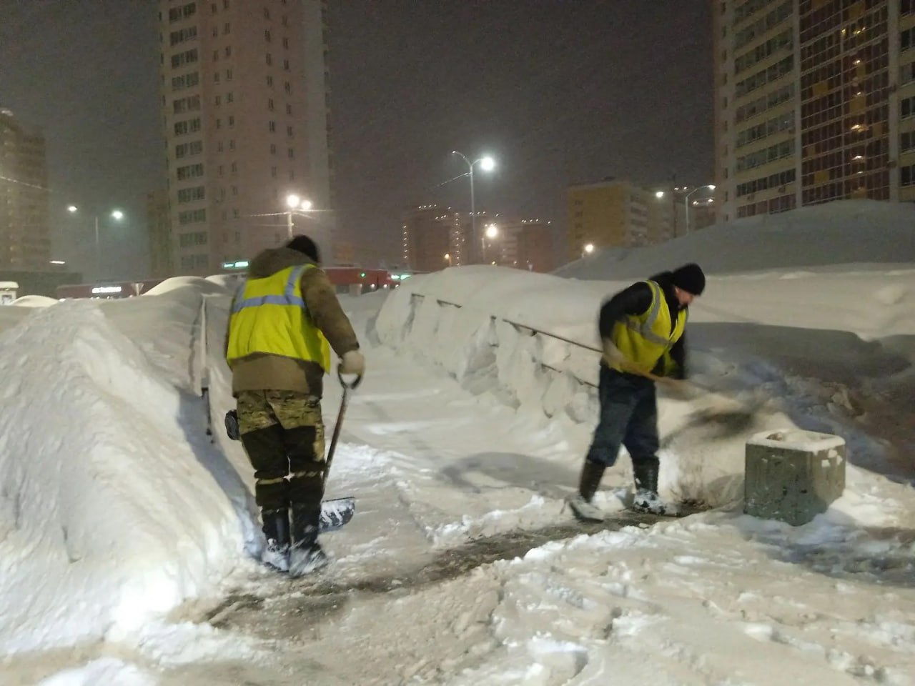В ночных работах были задействованы 208 единиц техники и 71 специалист ручного труда. За прошедшие сутки по дорогам и тротуарам были распределены 156 тонн галита и 117 тонн песко-соляной смеси, на полигоны было вывезено более 10 тысяч кубических метров снега.