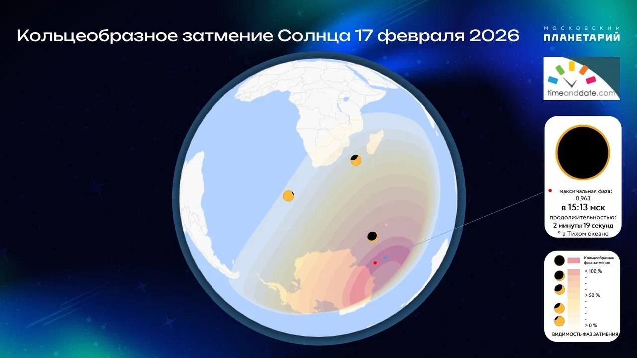Кольцеобразное затмение Солнца продлится с 12:57 и до 17:27 по мск. Область наилучшей его видимости попадает в приполярные и средние широты Южного полушария планеты. по информации Московского планетария.