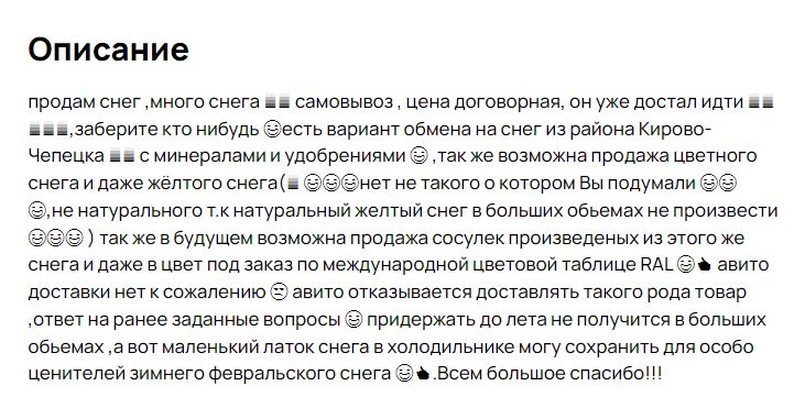 «Авито» отказывается доставлять такого рода товар... Придержать до лета не получится в больших объемах, а вот маленький лоток снега в холодильнике могу сохранить для особых ценителей зимнего февральского снега. Всем большое спасибо!!!», — резюмировал автор объявления.