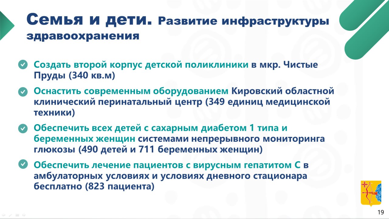 — На этот год предстоит создать второй корпус детской поликлиники в микрорайоне «Чистые Пруды» Кирова, увеличив ее площадь на 340 кв. метров.