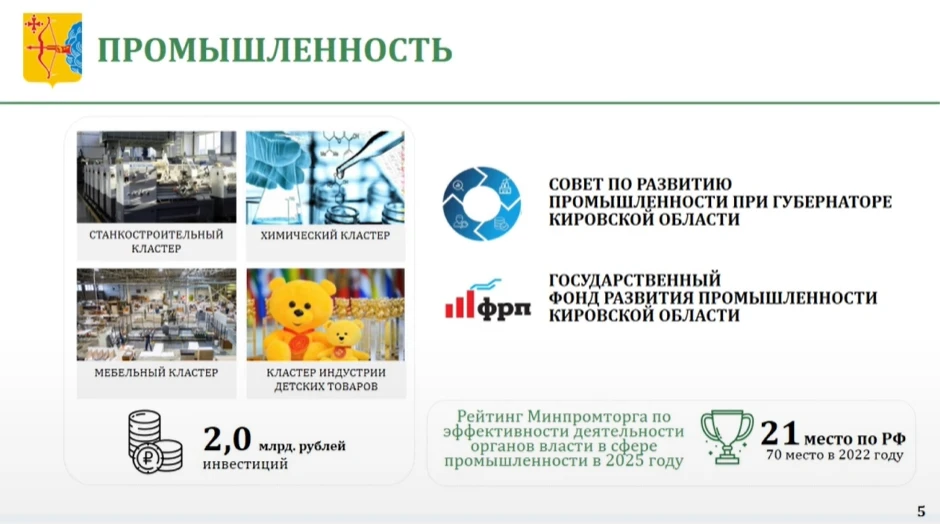 Также в 2025 году было принято решение о докапитализации Государственного фонда развития промышленности Кировской области на сумму 250 млн. рублей. Это позволит предоставить льготные займы промышленным предприятиям на сумму более 3 млрд рублей.
