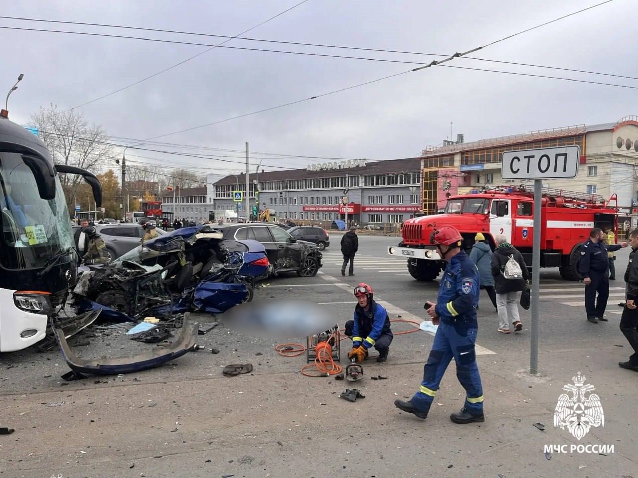 Жуткое ДТП накануне парализовало автомобильное движение на центральных улицах Ижевска. Легковой автомобиль врезался сначала в пешеходов, а затем в автобус, который вёз пассажиров из Перми в Казань.