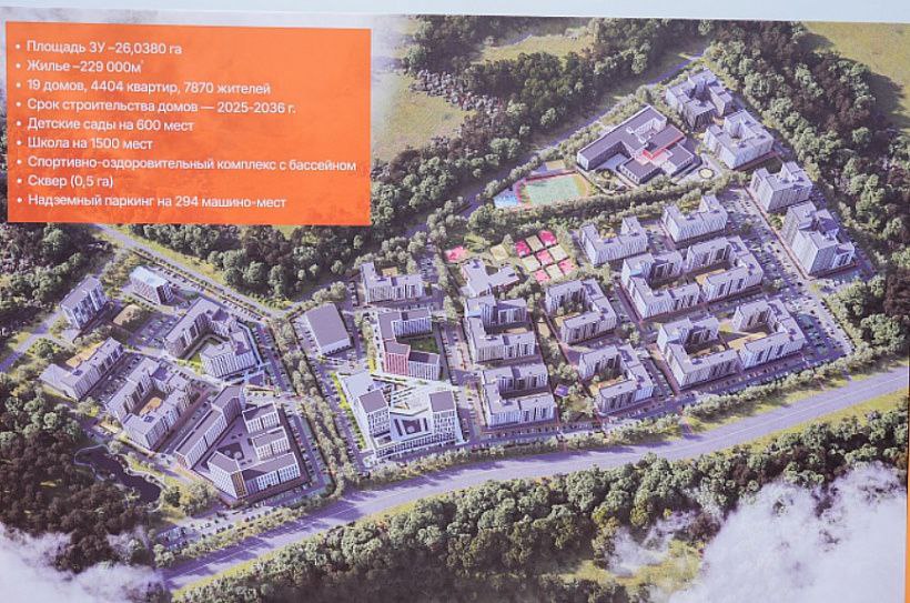 На 26 га разместятся 19 домов, в которых будет почти 4,5 тысячи квартир, детские сады на 600 мест, общеобразовательная школа и школа искусств, ФОК, сквер. Работы будет вести компания «Железно».