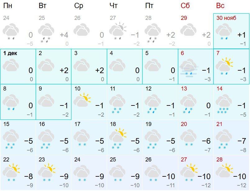 В первую неделю декабря осадков не прогнозируют, даже по ночам - около нуля. Во вторник и среду воздух прогреется до плюсовых значений, в субботу пойдет дождь.
