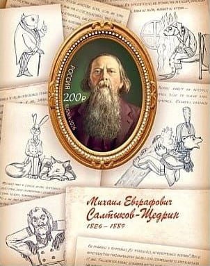 Знак почтовой оплаты содержит марку с портретом писателя номиналом 200 рублей, а также цитаты и иллюстрации к сказкам "Карась-идеалист", "Премудрый пискарь", "Здравомысленный заяц", "Медведь на воеводстве" и роману "История одного города"(12+).
