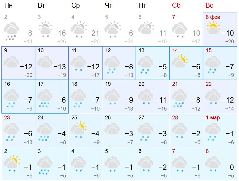Судя по прогнозам, самыми морозными станут понедельник и вторник предстоящей недели. Ближе к выходным потеплеет до -8, а во второй половине февраля столбик термометра даже по ночам не опустится ниже -15.