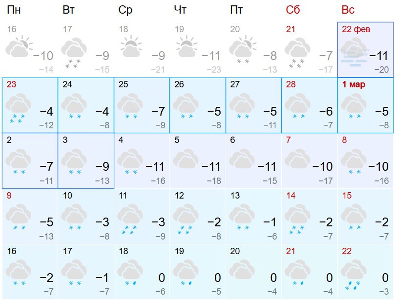 Первая неделя марта обещает стать прощальным подарком от — ночами будет подбираться к -20, днем — от -9-11 градусов.