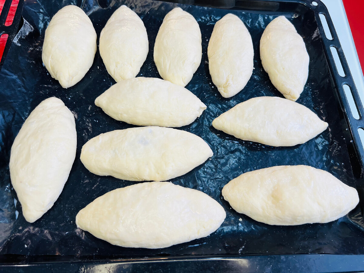 После того как все пирожки сформированы, разместить их на противне, смазанном маслом. Обязательно смазать яйцом для румяной корочки. Выпекать в предварительно разогретой до 180 градусов Цельсия духовке около 40 минут, пока изделия не приобретут золотистый оттенок.