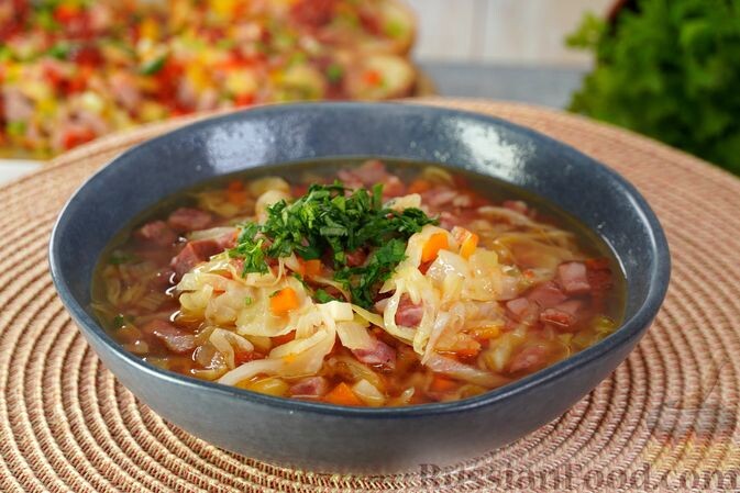 - Суп с копчёной колбасой и капустой. Обжаренные лук, морковь и корень петрушки соединяются с всеми любимой копчёной колбасой. Капуста и консервированные томаты придают блюду насыщенный вкус и яркий цвет.
