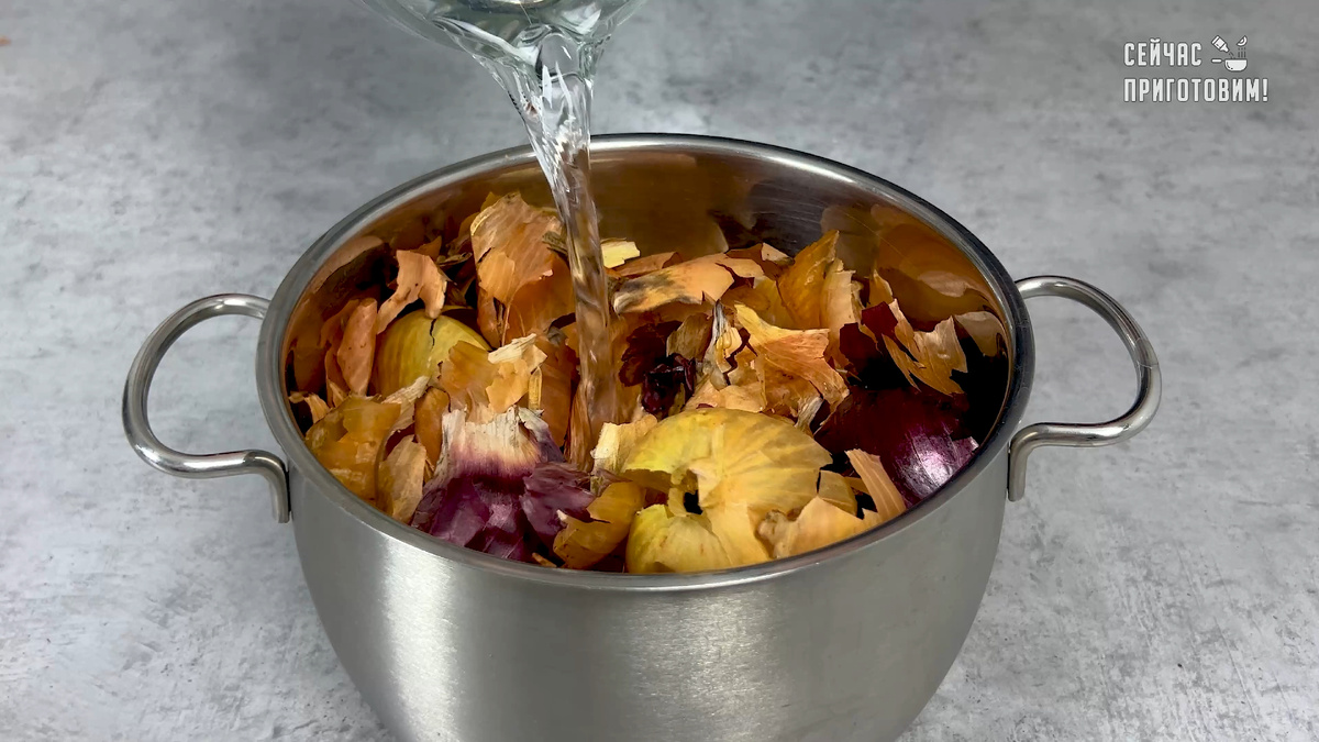 - Затем все заливается процеженным отваром из луковой шелухи, доводится до кипения и готовится на среднем огне под закрытой крышкой в течение 30 минут.