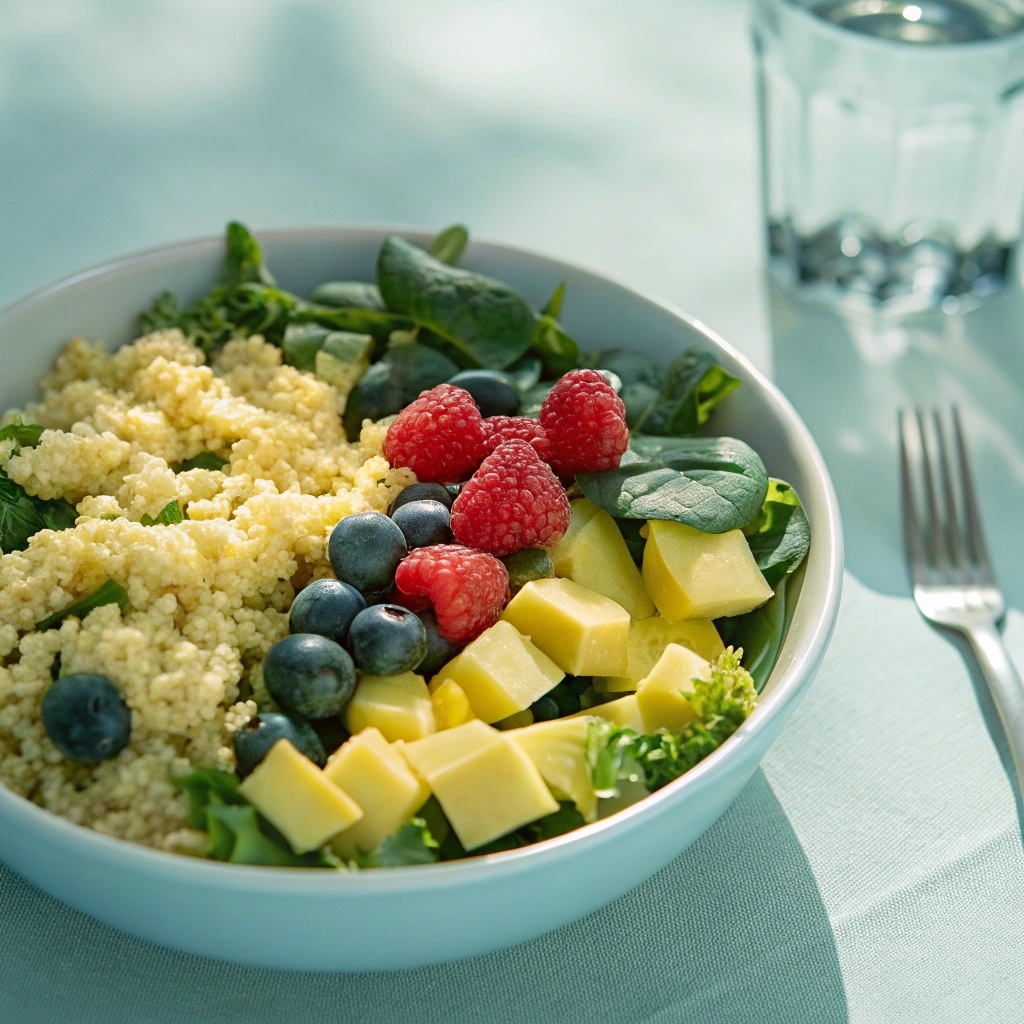 - Ингредиенты: 100 г киноа, 50 г кейла, 50 г шпината, 50 г свежей малины и черники, половина авокадо, 10 г оливкового масла, 5 г лимонного сока, соль и перец по вкусу.