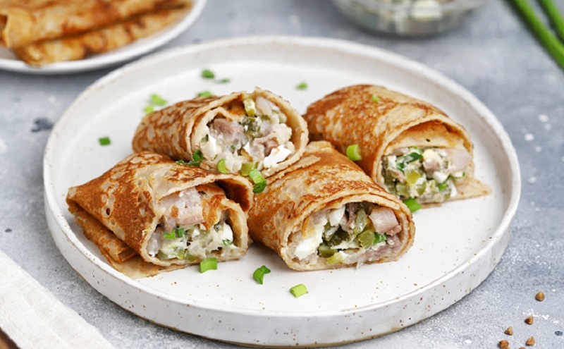 Этот рецепт предполагает использование уже готовых блинов, которые легко приготовить заранее или купить. Главное, чтобы они были нейтральными по вкусу, не сладкими. Сам процесс заключается в создании аппетитной начинки.