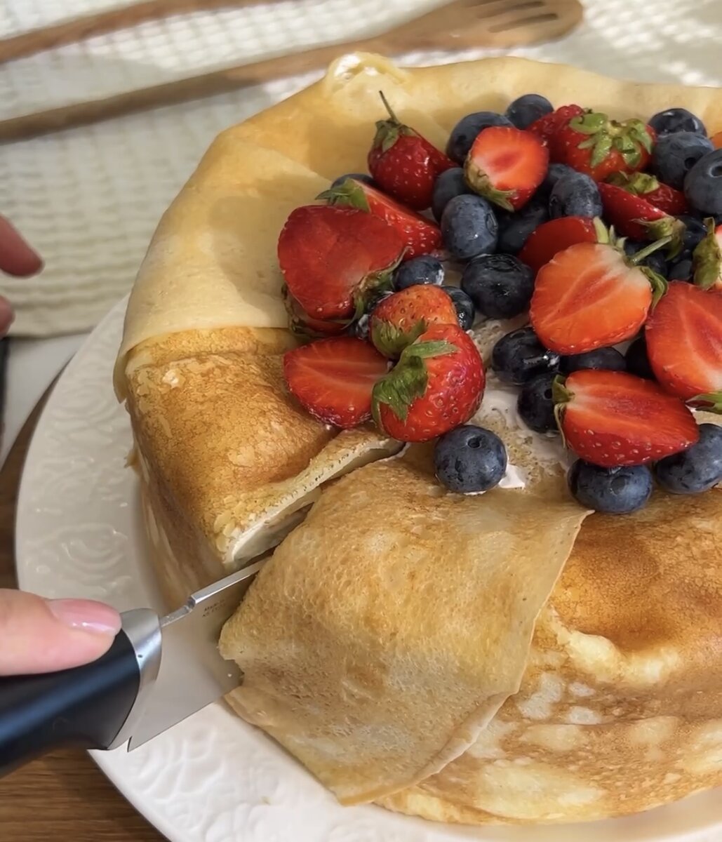 Собравшиеся блины обрезаются по краям, чтобы все слои выглядели аккуратно. На дно формы выкладываются целые блины, а остатки помещаются внутрь. Каждый слой намазывается начинкой, между ними укладываются ягоды. После того как последний блин накрыт, торт помещается в холодильник на ночь для застывания.