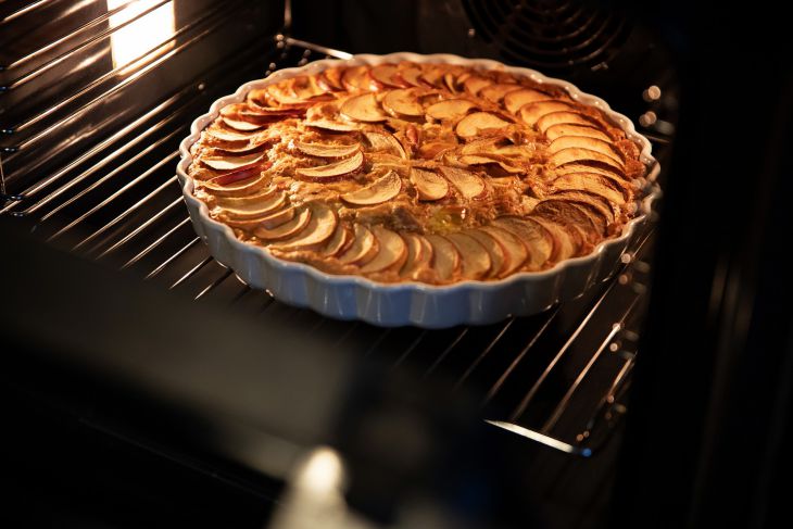 В полученную массу необходимо добавить белки, а также ввести яблоки, нарезанные кубиками. Полученное тесто следует вылить в форму, застеленную бумагой для выпечки, распределить ломтики яблок сверху, после чего выпекать в духовке, разогретой до 180 градусов, на протяжении 40 минут.