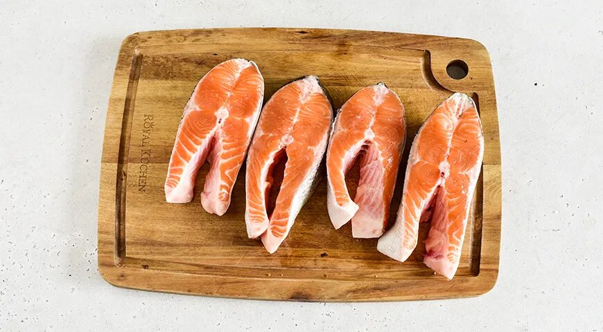 После того как стейки разморожены, их следует аккуратно разложить на рабочем столе. Примените к ним соль, черный перец и любимые сушеные травы. Сбрызните соком лимона, который не только придаст свежесть, но и усилит вкус рыбы. Пусть стейки постоят минут 15 при комнатной температуре, чтобы пропитать свою среду ароматами.