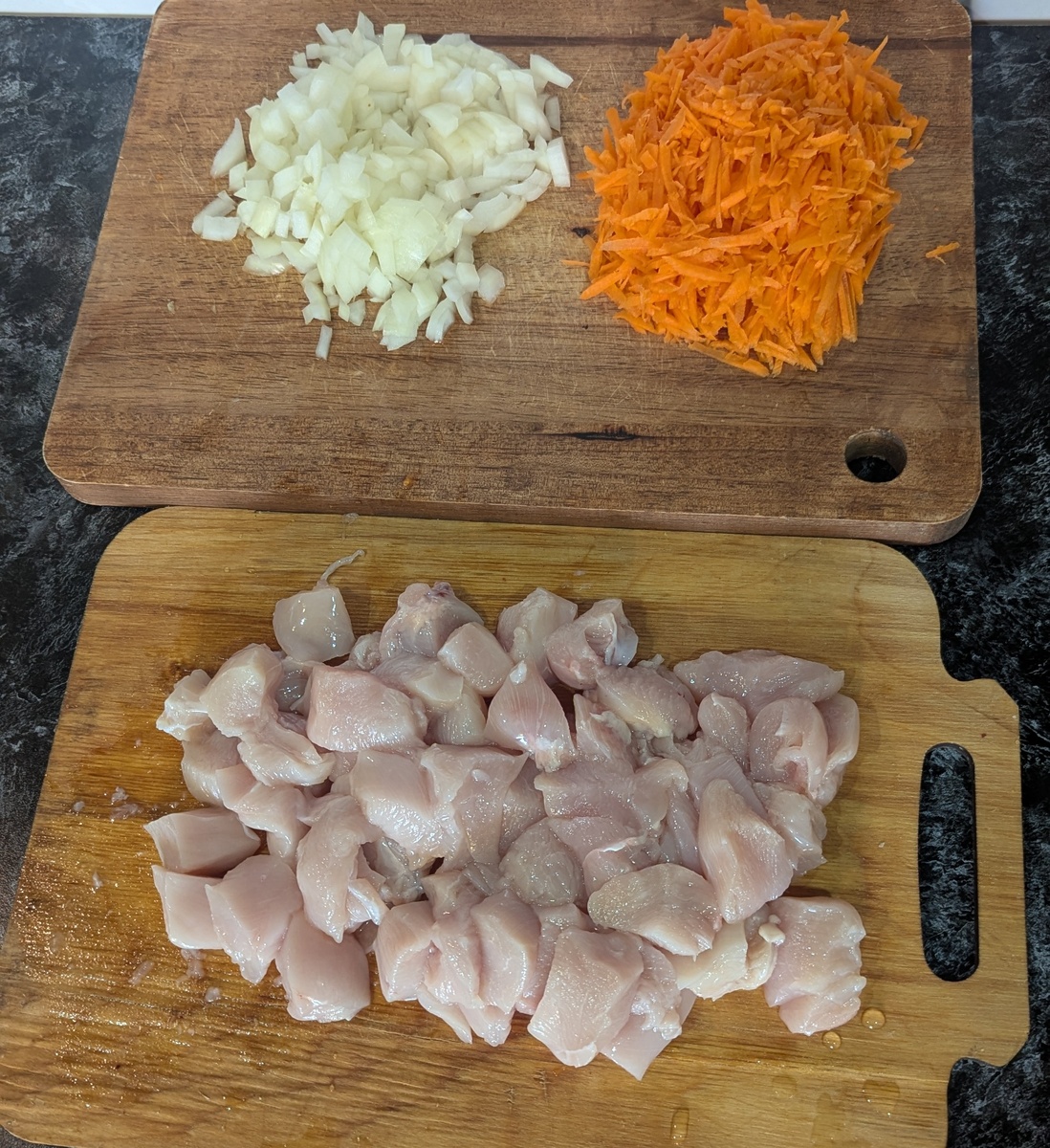 Лук нарезать кубиками, морковь натереть на крупной терке, а мясо порезать на кубики размером 1.5х1.5 см.