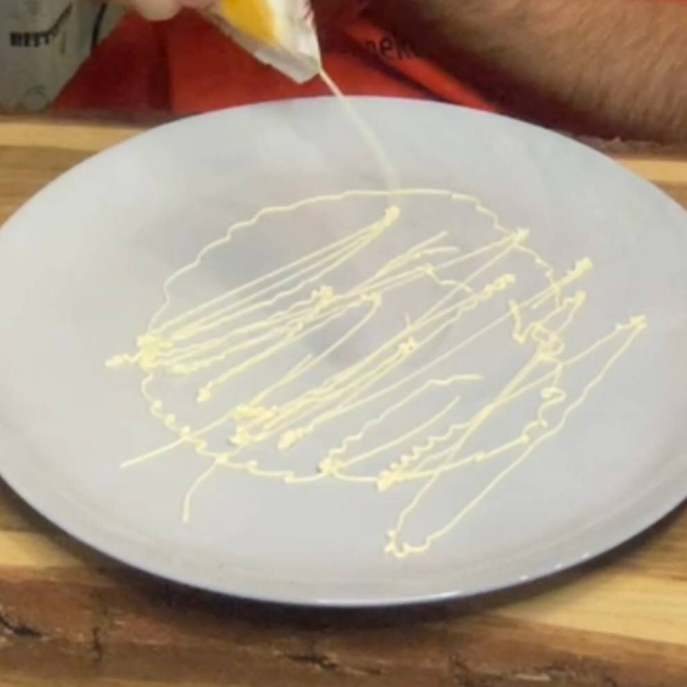 - Майонезный акцент: Начните с того, что на дно тарелки аккуратно выдавите майонез, создавая круговой узор. Удобнее всего делать это, отрезав уголок тюбика.