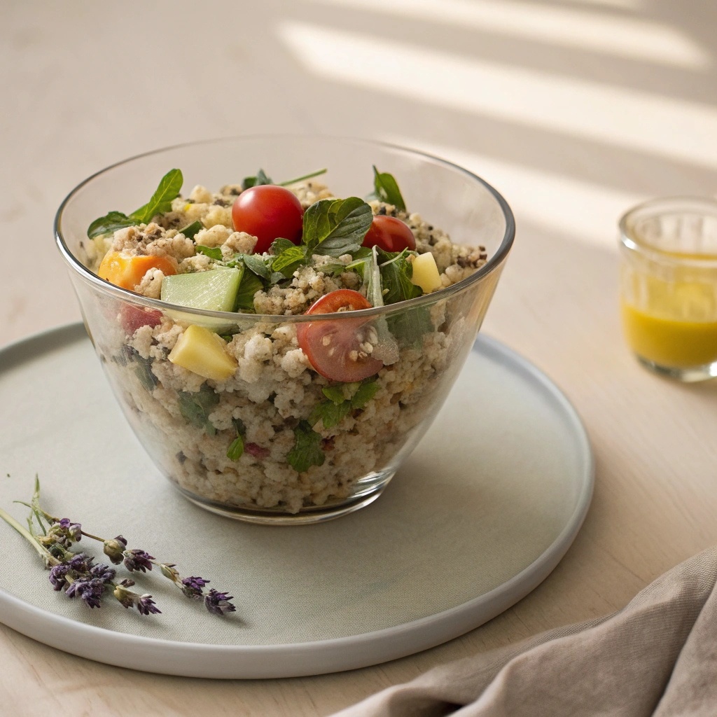 - Ингредиенты: киноа, свежий огурец, помидоры черри, шпинат, мята, лимонный сок и оливковое масло.