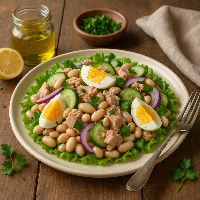 Легкий, сытный и питательный салат с тунцом, яйцом и фасолью идеально подходит для обеденного перерыва или легкого ужина. Сочетание свежих ингредиентов и насыщенных вкусов делает это блюдо настоящим находкой для занятых людей, которые стремятся к здоровому образу жизни.