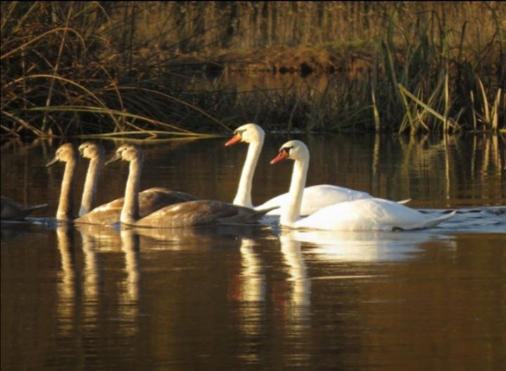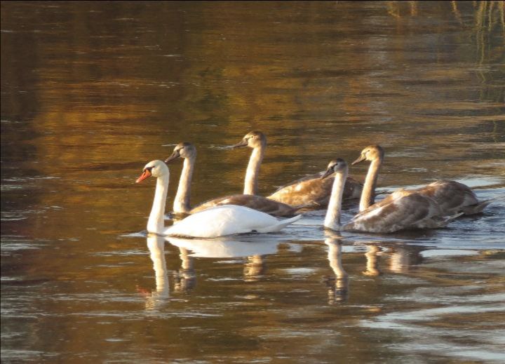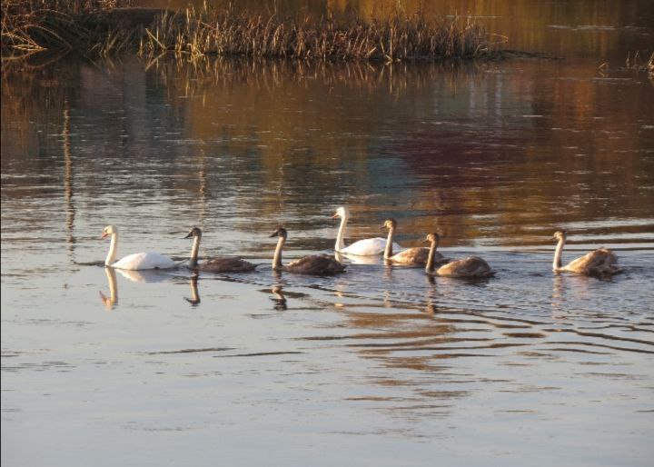 Во время осеннего перелёта в районе города Советска на реке Пижма останавились лебеди шипуны: пара с выводком из пяти подросших птенцов