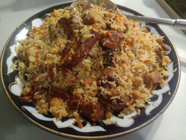 Приготовление начинается с разогрева казана, в который наливаются оба вида масла. Как только масло раскалится, добавляются свиные ребрышки, которые обжариваются до золотистой корочки. Затем к ним присоединяется нарезанный лук — он должен стать прозрачным, после чего можно добавить индейку. Когда все ингредиенты приобретут аппетитный цвет, партиями добавляется морковь, которая также должна немного подрумяниться. На следующем этапе в казан отправляется нут, изюм и специи. Заливайте все водой до уровня нута и оставляйте вариться на небольшом огне, пока нут не станет мягким. Тем временем рис также предстояло замочить.