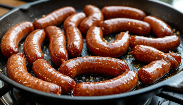 Первым делом подготовьте сосиски. Если они сырые, обжарьте их на сковороде с оливковым маслом примерно 10 минут, чтобы они приобрели золотистый цвет. Готовые сосиски необходимо выложить на отдельную тарелку.