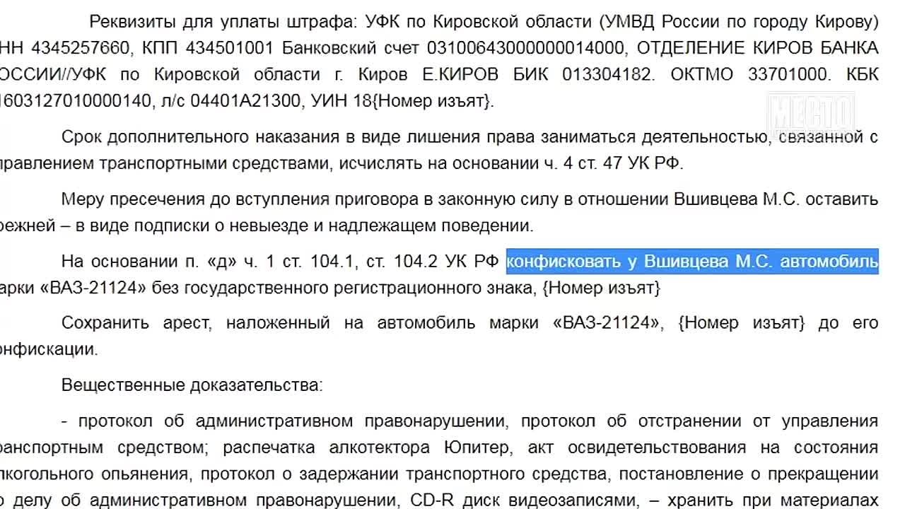 Помимо конфискации авто Вшивцева лишили права управления на 2 года и оштрафовали на 100000 рублей. Подсудимому дали лишь небольшое снисхождение: оплатить штраф он может частями в течение 5 месяцев.